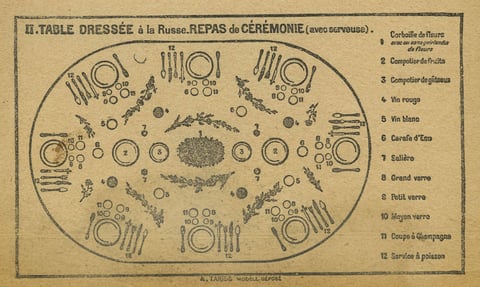 Stalo serviravimas "service à la russe", 1899, iliustracija iš knygos "Usages du monde" Baronne Staffe.